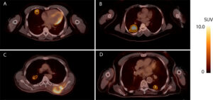 Figuur 1. Voorbeelden van [18F]FDG-PET/CT scans van patiënten met longmetastasen van wekedelensarcomen met verschillende metabole kenmerken. VOI’s (volumes of interest) zijn in oranje omlijnd. (A) Een metastase met een SUVmax van 6,1, vastgesteld 22 maanden na resectie van een ongedifferentieerd wekedelensarcoom in de rechter m. deltoïdeus; (B) Een metastase met een SUVmax van 9,0, vastgesteld 34 maanden na resectie van een ongedifferentieerd wekedelensarcoom in de rechter gluteus maximus; (C) Een metastase met een SUVmax van 5,2, gelijktijdig vastgesteld met een myxofibrarcoom afkomstig van de linker thoraxwand; (D) E metastase met een SUVmax van 7,2, gelijktijdig vastgesteld met een lokaal recidief van een leiomyosarcoom in het rechteronderbeen.