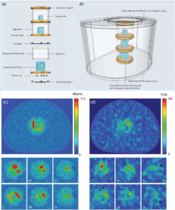 Figuur 2. A) Schematisch overzicht van het fantoom met drie segmenten/inzetstukken om verschillende gradaties van heterogeniteit na te bootsen; (B) Geassembleerd fantoom in een NEMA-NU2 IQ casing; Gedetailleerde afbeeldingen van (C) PET en (D) SPECT beelden van de grote (L), middelgrote (M) en kleine (S) inzetstukken, allemaal in dezelfde oriëntatie uitgelijnd.